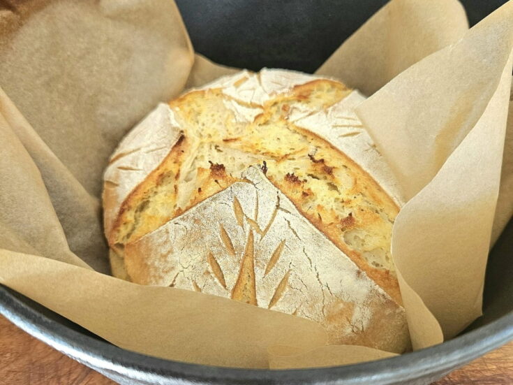 - Once you have a nice hard crust, carefully take your loaf out of the Dutch oven and let it rest on a cutting board or cooling rack for at least 45 minutes before cutting as it's still cooking on the inside. Then enjoy!
